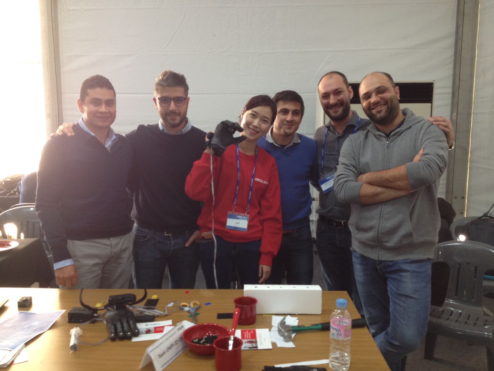 from left to right: Manuel Bonilla, Emanuele Luberto, Alessio Rocchi, Edoardo Farnioli, Gaspare Santaera. In the middle, the person randomly chosen from public to wear the SoftHand and perform the Challenge